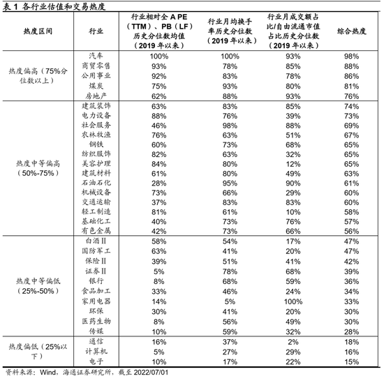 从估值和交易角度看,电新、汽车行业热度较高。除了超额收益外,我们继续从行业估值和交易指标的历史分位来看电新和汽车的行业热度如何。具体而言,估值指标方面我们使用行业指数相较全部A股的相对PE(TTM,下同)、相对PB(LF,下同)历史分位数,交易指标方面我们使用行业月成交额占比/自由流通市值占比、月均换手率的历史分位数。由于2019年以来至今A股经历了一轮牛市以及回撤的完整行情,因此我们以2019年初为起点来计算各指标的历史分位。从一级行业来看,电新、汽车行业整体热度较高,汽车综合热度为98%、电新为73%,详见表1。从电新和汽车的细分板块光伏和乘用车的估值热度来看,光伏相对PE(PB)处19年以来从低到高69.2%(97.2%)分位,乘用车相对PE(PB)处19年以来从低到高94.6%(89.1%)分位。交易热度方面,光伏行业月成交额占比/自由流通市值占比从4月的0.9上升至6月的1.2,乘用车从0.8上升至1.5;光伏月均换手率从4月的1.7%上升至6月的2.9%,汽车从0.8%上升至2.2%。