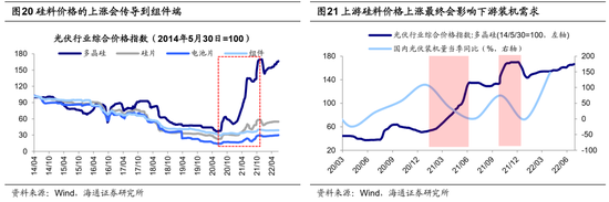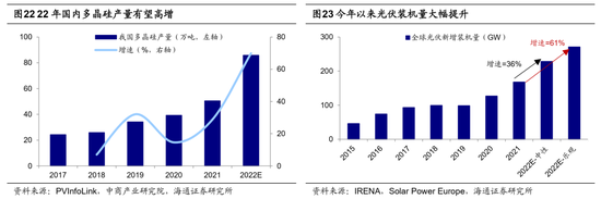 下半年光伏需关注硅料价格及海内外需求。20-21年光伏装机需求快速增长,硅片、电池片和组件企业大幅扩产,而上游硅料扩产周期较长,上下游结构性供需失衡,21年硅料价格大幅上涨。尽管价格传导到组件端时成本上涨幅度有所减少,但仍会对下游装机需求形成抑制。今年1月以来多晶硅价格指数上涨16%,后续是否会对光伏装机产生影响?根据PVInfoLink和中商情报网,预计22年多晶硅产量约85.8万吨,较21年增长71%,约可以提供314GW的组件使用。若下半年硅料产能逐步投放,硅料环节供应紧张或将缓解,硅料价格大幅上涨进而抑制装机需求的可能性不大。