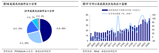事件+政策催化下,光伏海内外需求旺盛。海外来看,在俄乌冲突影响下能源价格飙升,欧洲清洁能源转型正加速。由于欧洲光伏制造成本较高且供应链尚不完整,欧洲的光伏组件主要依赖中国进口,21年欧盟是我国光伏组件的主要出口地区,占比46%。根据PVInfoLink公众号,今年1-4月中国向欧盟出口光伏组件24.4GW,同比增长144%。除欧盟外,6月美国宣布对从东南亚四国进口的光伏电池和组件免税 24 个月,而东南亚组件产能主要以国内厂商为主,因此国内厂商也有所受益。整体上看,今年光伏组件海外需求非常旺盛,1-5月我国光伏电池出口金额同比高增96%。