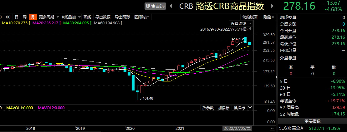 2020年4月以来,路透CRB商品指数已经走出了连续两年的牛市,期间最大涨幅达225%。