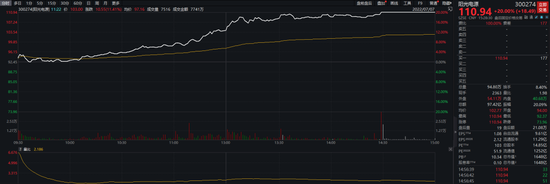 14点29分冲高涨停,阳光电源今日跨上“20cm”台阶,收涨于110.94元/股。