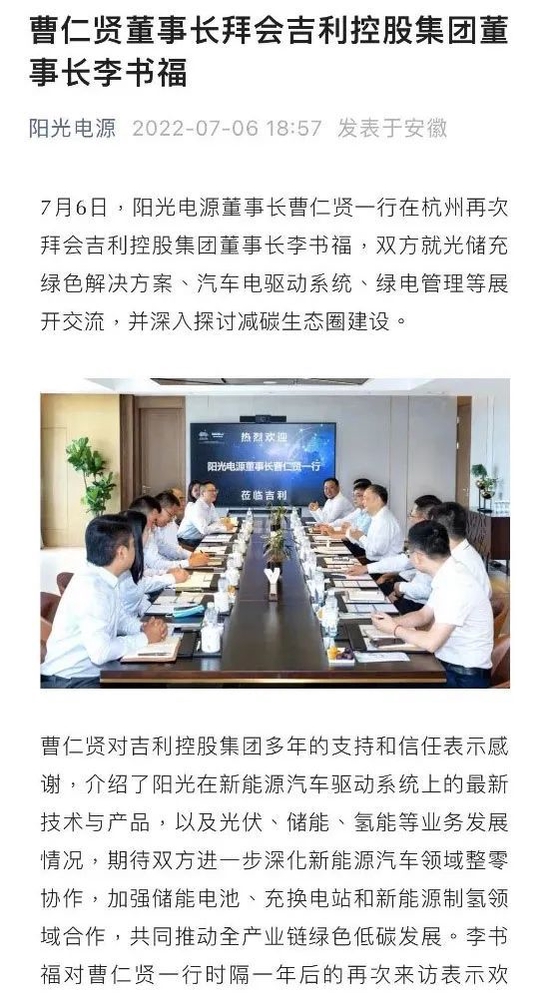 值得一提的是,就在前一天,阳光电源董事长曹仁贤刚刚与吉利控股集团董事长李书福在杭州“碰了头”。两家齐齐喊出“向新能源去”的公司,坐论光储充绿色解决方案、汽车电驱动系统、绿电管理等话题,共同探讨双方在储能电池、充换电站和新能源制氢领域的合作可能。