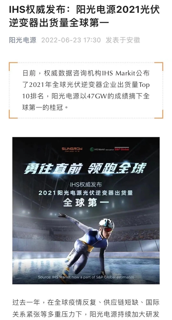 2022年6月,咨询机构IHS Markit公布了2021年全球光伏逆变器市场排行榜。其中一个最显著的变化是,2015年起持续雄踞全球光伏逆变器出货量第一与第二位的华为和阳光电源,在2021年排名对调——阳光电源冲到全球第一的位置,华为则因海外业务受阻成为全球第二。