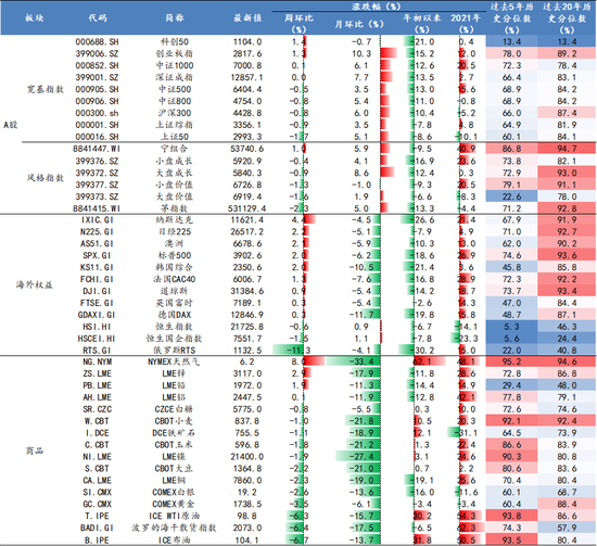 大宗商品方面,本周(7.4-7.8)多数大宗商品价格下跌,仅天然气(8.0%)、锌(2.9%)、铅(1.9%)、铝(0.1%)实现上涨,布油(-6.7%)、波罗的海干散货指数(-6.4%),原油(-6.3%)、黄金(-3.5%)、白银(-2.6%)领跌,多数大宗商品延续上周跌势。领跌商品的主要原因:海外流动性持续收紧,欧美经济衰退预期上升,市场担忧海外需求下降,大宗整体表现不佳。