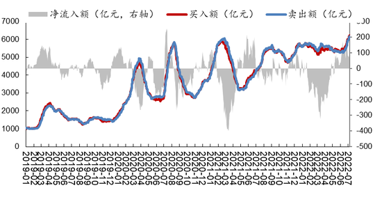 资金方面,本周(7.4-7.8)整体交易情绪回升,主要表现为:(1)内资方面,两融余额环比上升,其中,融资交易金额环比上升269.31亿元;场内基金周度累计值处于净流出,且近30日净流入周环比下降32.65亿元;(2)外资方面,陆股通资金周度累计值处于净流入状态,且近30日资金净流入环比回升17.7亿元。