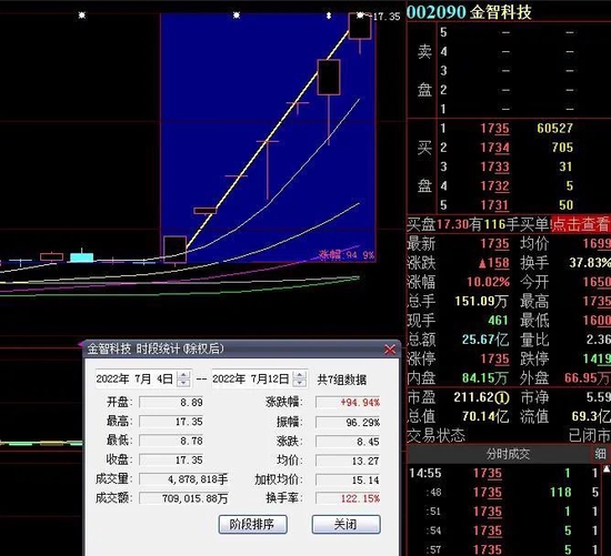 7月12日,热门股金智科技再度涨停,截至收盘,报17.35元,连续7个交易日涨停,期间累计涨达94.94%。