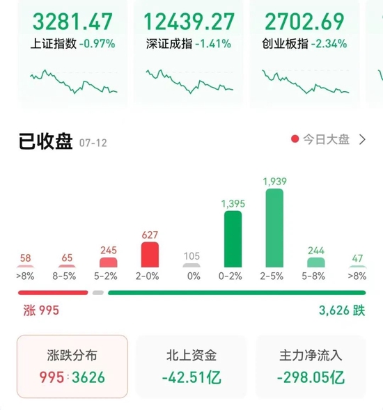 7月12日,三大股指集体收跌,截至收盘,上证指数跌0.97%报3281.47点,深证成指跌1.41%报12439.27点,创业板指跌2.34%报2702.69点;两市合计成交9768亿元,终结了连续13个交易日万亿元以上的成交额,北向资金今日净卖出金额达42.51亿元。总体来看,两市个股跌多涨少。