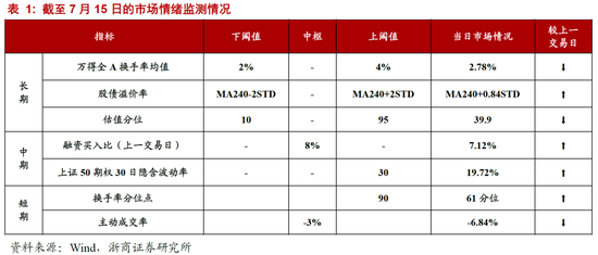 从短期市场情绪来看,周三主动成交率5日均值向20日均值快速收敛后意味着市场可能企稳,受地产状况和周末避险情绪影响周五短期情绪再度转向。进一步结合多维情绪监测体系,短期影响并未让市场情绪大幅转差,市场情绪仍较有韧性。具体来看,中长期指标中,换手率均值、估值分位小幅下降,股债溢价率、期权隐含波动率上升,换手率分位点上升,主动率降幅较大。