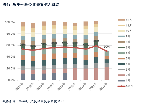 第五,线索四是政策的想象空间。对于2022年来说,出口外生、消费约束,政策主要抓手是固定资产投资。上半年政策都是围绕这条线,留抵退税为带动制造业投资,财政前置为带动基建投资,因城施策为稳定地产投资。下半年政策的理论空间依旧在FAI的三大领域,包括增量财政政策工具缓和收支缺口、一线和准一线地产政策、鼓励新产业投资和制造业技术升级改造投资等。我们理解目前这一逻辑并无变化。财政和就业平衡是两个重要观测视角。从6月财政数据看,下半年财政收入仍需要赶进度(图),政府性基金收支端也亟待土地出让金代表的收入端修复,以及准财政工具的支撑。就业数据显示16-24岁调查失业率仍明显偏高。7月13日国务院常务会议指出就业是头等民生大事、稳经济大盘的重要支撑,稳就业任务依然繁重。央行7月以来连续30亿元低量逆回购操作可能带来了关于货币政策微调的预期扰动,但这一点应该不对应货币政策总基调变化,6月底易纲行长表示货币政策将继续从总量上发力以支持经济复苏。