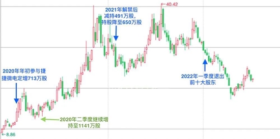 以使其获利丰厚的捷捷微电为例,2020年初,周雪钦参与了捷捷微电的定增配售,最终获配713万股。2020年二季度,在公司股价大涨之前,周雪钦继续在二级市场加仓,当年二季度末,周雪钦持有捷捷微电的股份进一步增至1141万股。2021年1月8日定增限售股解禁后,周雪钦实现了巨大的浮盈,一季度期间对捷捷微电大幅减仓,季度末持股已降至650万股。最终,在整整持有两年多后,周雪钦于2022年一季度退出了捷捷微电前十大股东行列,但其通过在持有期间二级市场的精准操作,成功扩大了自己的盈利。