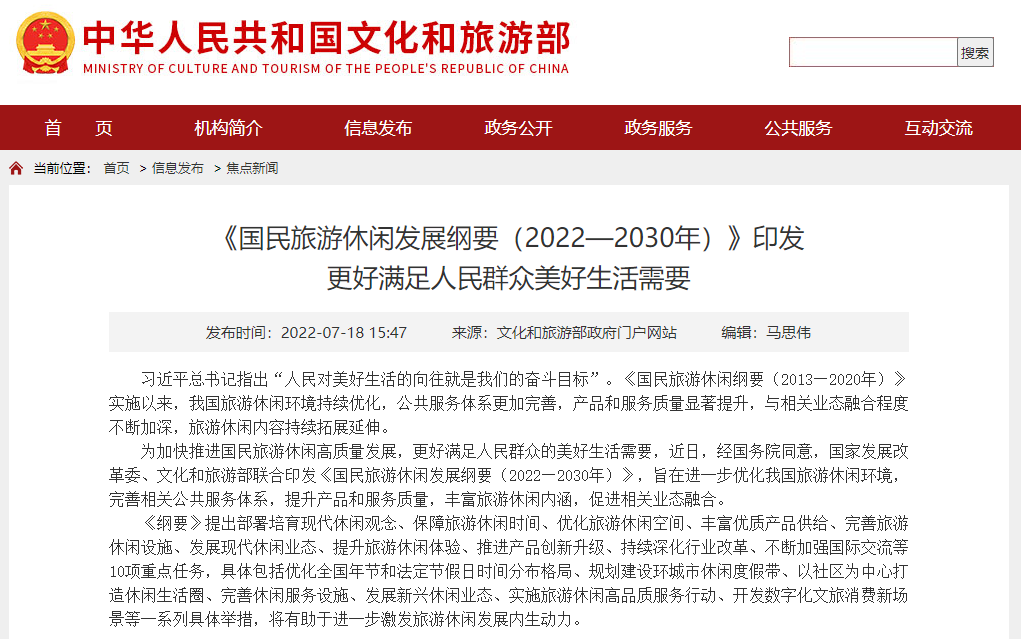 根据文化和旅游部政府门户网站消息,近日,经国务院同意,国家发展改革委、文化和旅游部联合印发《国民旅游休闲发展纲要(2022—2030年)》,旨在进一步优化我国旅游休闲环境,完善相关公共服务体系,提升产品和服务质量,丰富旅游休闲内涵,促进相关业态融合。
