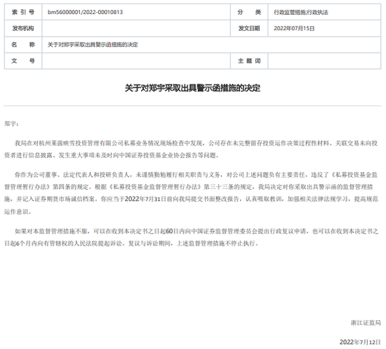 同日下发的另一份罚单,针对莱茵映雪的董事、法定代表人和投研负责人郑宇。因未谨慎勤勉履行相关职责与义务,对公司上述问题负有主要责任,浙江证监局对其予以监管警示,并记入证券期货市场诚信档案,同样要求“限期写检查”。