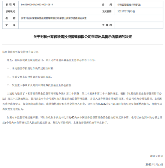依据《私募投资基金监督管理暂行办法》的相关规定。浙江证监局对莱茵映雪采取出具警示函的监管措施,并记入证券期货市场诚信档案。在劝勉其提高规范运作意识,谨慎勤勉履行私募基金管理人职责的同时,浙江证监局要求莱茵映雪在2022年7月31日前提交书面整改报告,杜绝今后再次发生违规行为。