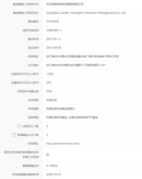 行家例行查看了中基协信息。莱茵映雪成立于2015年4月,同年6月备案。注册资本1000万元,实缴资本比例50%。目前从业人员3名,低于监管“红线”;管理规模5-10亿元。