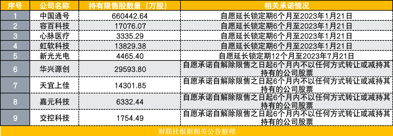 经梳理,中国通号、容百科技、心脉医疗、虹软科技4家公司控股股东或者控股股东及其一致行动人等延长股份锁定期6个月至2023年1月21日。另有,c控股股东康为民自愿延长锁定期12个月至2023年7月21日。