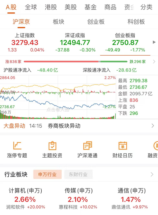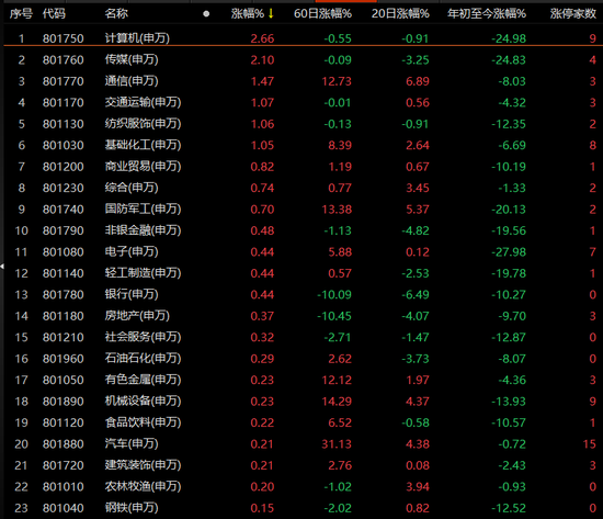 计算机板块以2.66%涨幅强势领跑,231只个股收涨,润和科技等9只个股涨停。传媒板块涨幅也超过2%,恒大高新开盘涨停,之后盘中被炸开,但最终仍涨停。此外,通信、交通运输、纺织服饰、基础化工板块涨幅超过1%,表现较好。