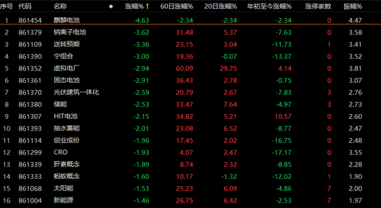 电力设备、新能源概念板块“熄火”,麒麟电池、固态电池、光伏建筑一体化、储能、太阳能、新能源等概念板块跌幅靠前。