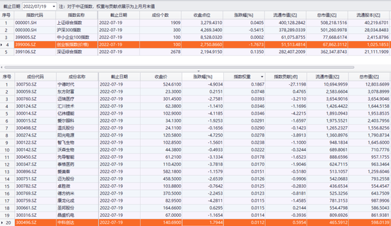 7月19日,在电力设备、新能源、医药生物等权重股的拖累下,创业板指弱势收跌1.77%,深市明显弱于沪市。