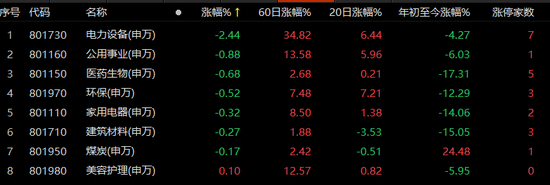 今日电力设备板块低开低走,跌幅超过2%。双一科技等9只中小市值个股涨停,拖累板块的是宁德时代等“大哥哥”,“宁王”全天低迷最后收跌4.9%报524.61元/股,最新市值为1.28万亿元;隆基绿能、亿纬锂能、国电南瑞、阳光电源等千亿市值个股跌幅较大。此外,公共事业、医药生物、环保板块表现弱势。
