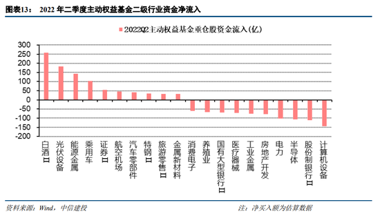 从公募资金行业流向来看,2022年二季度有约260亿资金流向食品饮料行业,新能源板块里能源金属、光伏设备、新能源整车方向的资金净流入均超过100亿。另一方面,银行、计算机、医药生物以及半导体和电力板块,净卖出超过100亿。