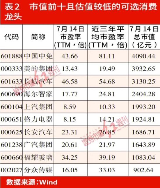 不过,相对而言,可选消费龙头的动态市盈下降幅度更大一些,如分众传媒、中国中免、格力电器等公司的动态市盈降幅均在40%以上,而日常消费龙头中动态市盈下降幅度居前的山西汾酒和五粮液均在30%~40%区间(见表2)。