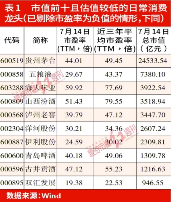 而据《红周刊》观察,日常消费和可选消费的龙头的估值相较近三年的估值中枢普遍有所下滑。典型的如贵州茅台,其动态市盈率较近三年平均水平已下降11.01%。其他包括五粮液、海天味业、山西汾酒、泸州老窖、洋河股份、伊利股份、青岛啤酒、古井贡酒、双汇发展等在内的消费龙头的动态市盈降幅同样在10%以上(见表1)。