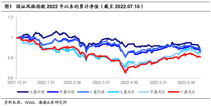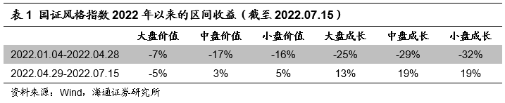 以2022.04.28为时间节点,在此之前,2022年市场偏向价值风格,国证中盘成长和小盘成长指数的累计跌幅分别高达29%和32%,调整幅度高于另外4个风格指数。A股反弹序幕拉开之后,市场偏向成长风格。截至2022.07.15,国证中盘成长和小盘成长指数均累计上涨19%,反弹幅度位居各风格指数之首。