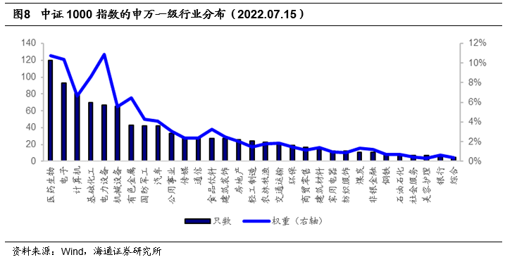 我们以截至2022年7月15日的指数最新成分股及权重,观察其分布特征。从市值分布来看,300亿以上的成分股数量为36只,权重占比仅为10.3%;100-300亿的成分股共有447只,权重占比最高,达到56.4%;100亿以下的成分股数量最多,共有517只,权重占比33.3%。指数成分股的中小盘风格较为鲜明。