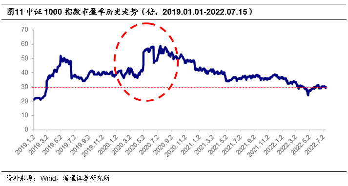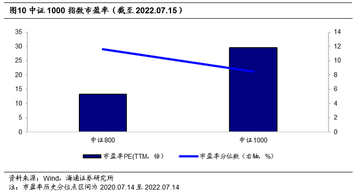 截至2022年7月15日,中证1000指数的市盈率(PE,TTM)为29.7倍。虽高于中证800指数,但从时间序列上来看,指数目前的估值位于过去2年的8.5%分位点,位于基日(2004年12月31日)以来11.3%分位点,均低于中证800(11.6%、31.2%)。考虑到高成长的属性,我们认为,指数目前估值性价比较高。