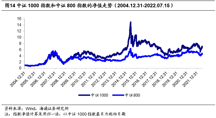 中证1000指数(000852.SH)是为了综合反映中国A股市场中一批小市值公司的股票价格表现而编制的。指数成分股中小盘风格较为鲜明,板块分布较为均衡,以成长属性较强的行业为主。我们认为,相较中证800指数,指数具备研发投入大、利润增长快、估值性价比高等特征。同时,指数弹性较好,中长期业绩表现优异,风险调整后收益佳。自基日(2004年12月31日)以来,截至2022月7月15日,指数累计收益6.1倍,年化收益高达12.15%。因此,我们认为,中证1000指数具备较高的投资价值。
