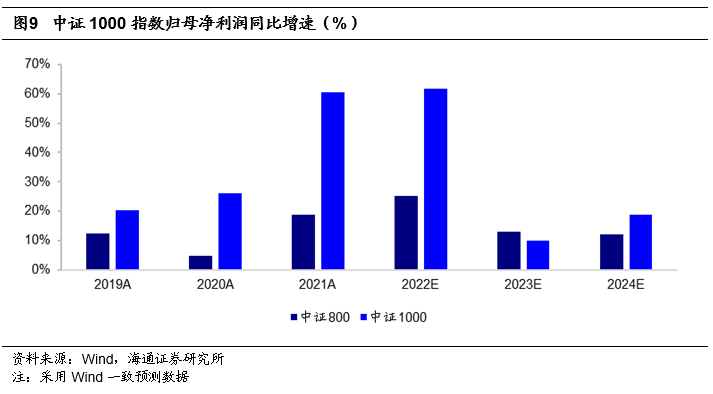 2019-2021年,中证1000指数的归母净利润同比增长率分别为20.3%、26.1%和60.7%,均显著高于中证800指数(12.3%、4.7%和18.9%)。与此同时,根据Wind一致预测数据,中证1000指数在2022-2024年期间的归母净利润同比增长率为61.8%、10.0%和18.7%。除2023年外,也显著高于中证800指数(25.2%、13.0%、12.0%)。由此可见,不论从历史数据还是预测数据来看,指数的净利润增速较高。
