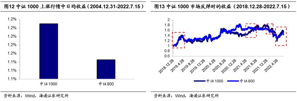 2004.12.31-2022.07.15,中证800指数上涨的交易日,中证1000相对中证800的日均超额收益为0.08%。进一步选取2018.12.31-2019.04.19、2021.04.28-2021.08.30、2022.02.14-2022.03.03 和2022.04.28-2022.07.15,四个市场涨幅较为明显的时间段(下图红框标注部分),中证1000在这4个区间内的涨幅分别为41.2%、20.7%、4.8%和24.7%,远超中证800指数(37.5%、-0.02%、0.58%和9.7%)。