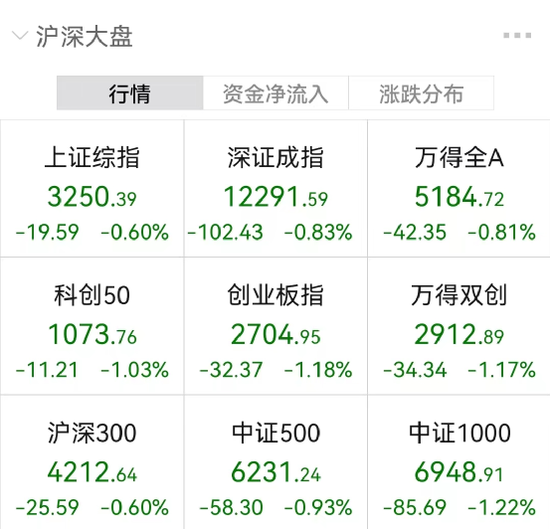 三大股指集体下行,截至收盘,上证指数报3250.39点,下跌0.60%;深证成指报12291.59点,下跌0.83%;创业板指报2704.95点,下跌1.18%;科创50指数报1073.76点,下跌1.03%。