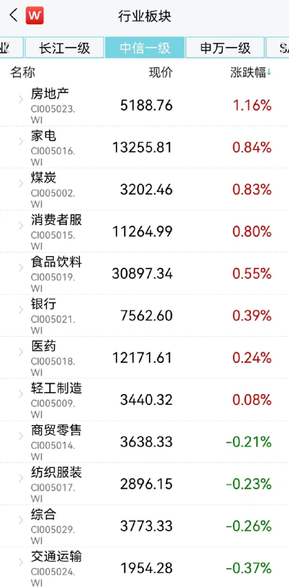 A股整体震荡收跌,中信一级行业中,大部分行业下跌,小部分行业上涨。地产产业链迎来反弹,房地产、家用电器等板块逆市上涨,一扫近日低迷,具体来看,房地产、家电、煤炭涨幅居前,分别上涨1.16%、0.84%、0.83%。