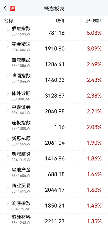 从概念板块来看,受消息面影响,猴痘概念领涨,今日涨幅超5%。