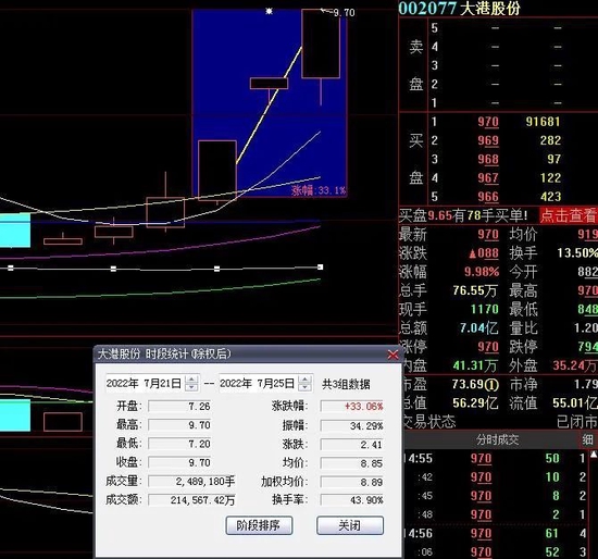 7月25日,大港股份再度涨停,截至收盘,报9.70元,连续3个交易日涨停,期间累计涨达33.06%。