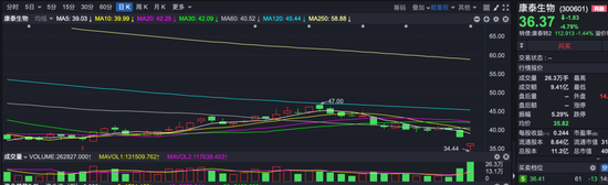 受此消息影响,康泰生物今天开盘后一度放量下跌10%,随后股价有所回升,但收盘时依然跌幅近5%。