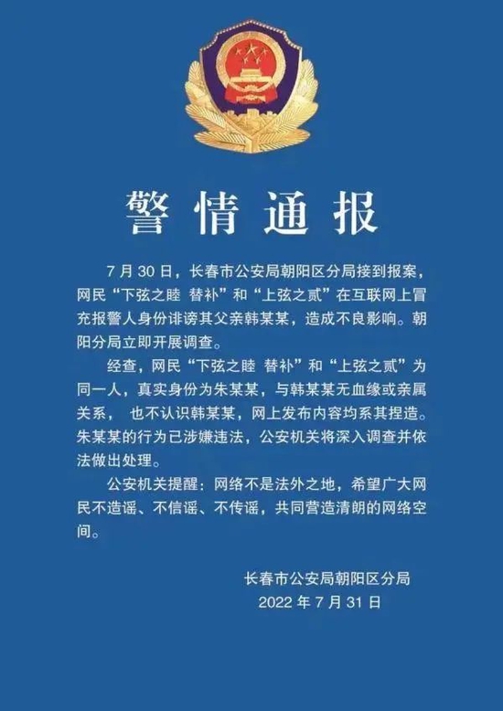 今天,长春市公安局朝阳区分局发布通报:7月30日,长春市公安局朝阳区分局接到报案,网民“下弦之睦 替补”和“上弦之贰”在互联网上冒充报警人身份诽谤其父亲韩某某,造成不良影响。朝阳分局立即开展调查。
