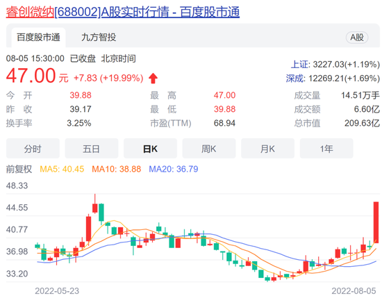 睿创微纳即所处上周市场表现活跃的半导体板块,也是科创50指数中的成员。上周五(8月5日),睿创微纳单日股价大涨19.99%,报收47元/股,最新市值约210亿元。