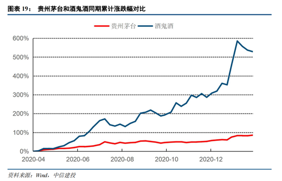 对于个股而言,小盘股的弹性表现得更加明显。我们以贵州茅台作为大盘股代表,酒鬼酒作为小盘股代表,对比两支股票在2020年4月至2021年1月期间的股价表现。在此期间,酒鬼酒股价累计上涨最高接近600%,而茅台累计涨幅仅有85%,对于个股而言,小盘股的弹性表现得更加明显。