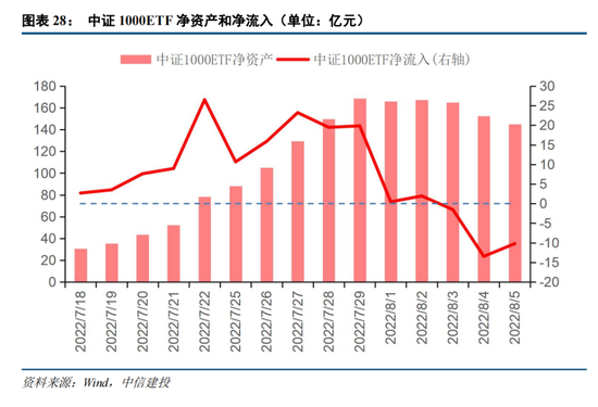 中证1000长期来看将吸引资金流入。7月22日,中证1000股指期货推出后,市场对于中证1000指数的配置热情高涨,市场新发4只ETF基金。同时已有的ETF基金规模在期货推出前净资产仅为52亿,7月22日当日迎来26亿净流入,后续一周净流入89亿,ETF规模翻了三倍。虽然八月以来随着期货推出带来的投资热情冷却,1000ETF资金有一定流出,但对于扩大后的ETF规模的影响已经相对较小。中证1000ETF、股指期货和期权的推出弥补了投资者特别是机构投资者对于中小市值股票投资和风险对冲工具的不足,长期来看有利于资金流入中证1000ETF和相关成分股,有望对未来中小盘的行情起到推动作用。