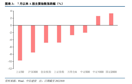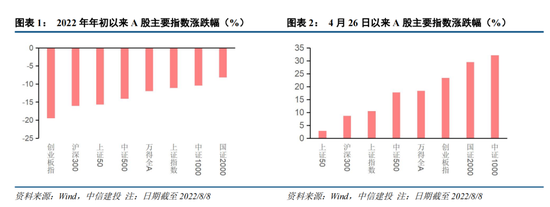 当前市场表现中小盘占优。我们从2022年年初、4月26日市场见底进入反弹阶段、7月市场走弱三个时间节点至今复盘当前的中小盘行情,三个阶段中小盘表现都显著优于大盘,表现在今年以来中小盘跌幅更小,市场开始反弹后中小盘力度更大;尤其是7月以来中小盘与大盘表现出现分化,市场整体走弱阶段中小盘逆势上涨;整体来看,中小盘的表现强于大盘,当前市场风格中小盘占优。