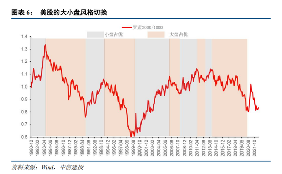 不只是A股,美股同样存在类似的大小盘风格轮动现象。美股市场以制度成熟,机构化水平较高著称,回顾美股40年来的历史,同样存在着大小盘的风格轮动现象,但与A股有所不同之处在于美股轮动的周期性不明显,但足够证明股票市场上的风格从来不是单一主导或者混乱无规律的,而是一段时间内由某种风格持续主导,大小盘风格的轮动是确实存在。大小盘指数之间往往能够维持在一个合理的比例区间内。