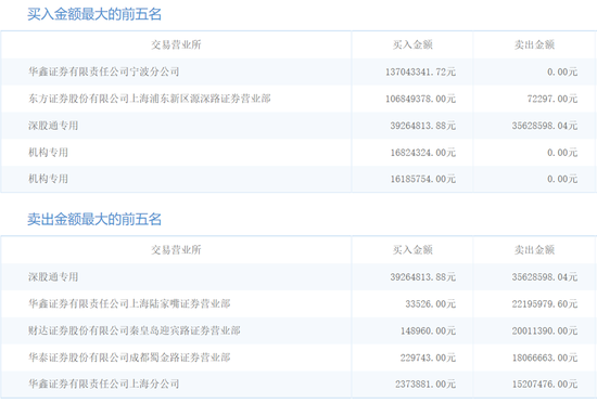 盘后龙虎榜数据显示,深股通买入3926.48万元并卖出3562.86万元,两机构合计买入3301.01万元;买一华鑫宁波、买二东方证券源深路营业部买入额均超过1亿元。