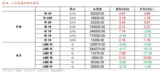 本周工业金属价格涨多跌少,镍价格下跌;库存多数下降。截至8月10日,锡价格较上周上涨2.31%为199500.0元/吨;钴价格较上周上行7.74%为348000.0元/吨;铅价格15200.0元/吨,周环比上行0.16%;铝价格周环比上行3.18%至18800.0元/吨;铜价格62220.0元/吨,周环比上行2.67%;长江有色市场锌价格为25230.0元/吨,周环比上行4.43%;长江有色金属镍价格周环比下行3.94%至175500.0元/吨。