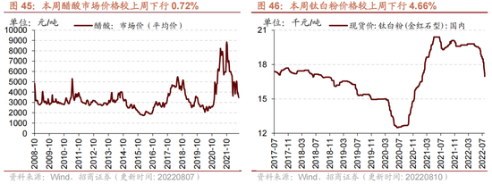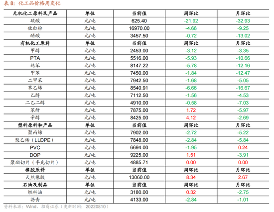 无机化工品期货价格多数下跌。截至8月10日,钛白粉市场均价较上周下跌4.66%为16970.0元/吨。截至8月10日,纯碱期货结算价较上周下行1.40%至2612.00元/吨。截至8月7日,醋酸市场均价较上周下行0.72%至3457.50元/吨;截至7月31日,全国硫酸价格周环比下行21.92%至625.40元/吨。