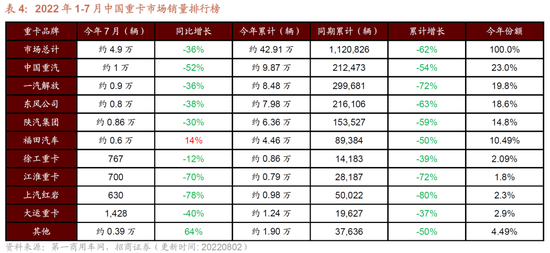 7月份重卡销量同比降幅收窄明显,但还是创最近7年的最低值。据第一商用车网数据,2022年7月国内重卡市场销量大约为4.9万辆,环比小幅下降11%,较上年同期的7.63万辆下降36%,净减少2.73万辆。今年7月份是自2016年以来7月份销量的最低点,也是重卡市场自去年5月份以来的连续第十四个月下降,降幅为今年以来七个月历史最低点。但考虑到去年7月1日实施柴油车国六排放法规,7月销量断崖式下跌,今年同比降幅收窄不应该过多乐观。1-7月重卡市场累计销售42.9万辆,比上年同期的112.1万辆下降62%,减少了69万辆。