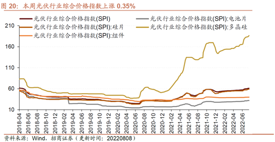 本周光伏行业综合价格指数上行,多晶硅价格指数上行,组件、电池片、硅片指数保持不变。截至8月8日,光伏行业综合价格指数为61.02,较上周上升0.35%;组件价格指数维持在39.86;电池片价格指数维持在31.79;硅片价格指数维持在58.69;多晶硅价格指数为186.38,较上周上升1.35%。