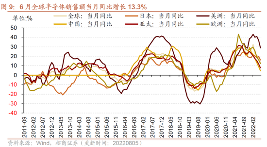 6月全球半导体销售额同比增幅缩窄,美洲、欧洲、日本、中国和亚太地区销量同比增幅均有所缩窄。根据美国半导体产业协会统计数据,6月全球半导体当月销售额为508.2亿美元,同比上行13.3%,较上月份涨幅缩窄4.7个百分点。从细分地区来看,美洲半导体销售额为120.9亿美元,同比增长29.0%,较上月涨幅缩窄7.9个百分点;欧洲地区半导体销售额为43.9亿美元,同比增长12.4%,涨幅较上月缩窄3.7个百分点;日本半导体销售额为41.0亿美元,同比增长16.1%,涨幅较上月缩窄3.7个百分点;中国地区半导体销售额为165.4亿美元,同比增长4.7%,涨幅较上月缩窄4.4个百分点;亚太地区半导体销售额为302.4亿美元,同比增长7.8%,涨幅较上月缩窄4.2个百分点。