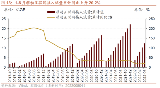 6月移动互联网接入月户均流量同比继续上行。6月移动互联网接入月户均流量为15,247.36MB,同比上升10.13%,较上月环比下行4.37%;1-6月移动互联网接入流量累计值为1241.0亿GB,累计同比上升20.2%,较上月增幅缩窄了1.2个百分点。